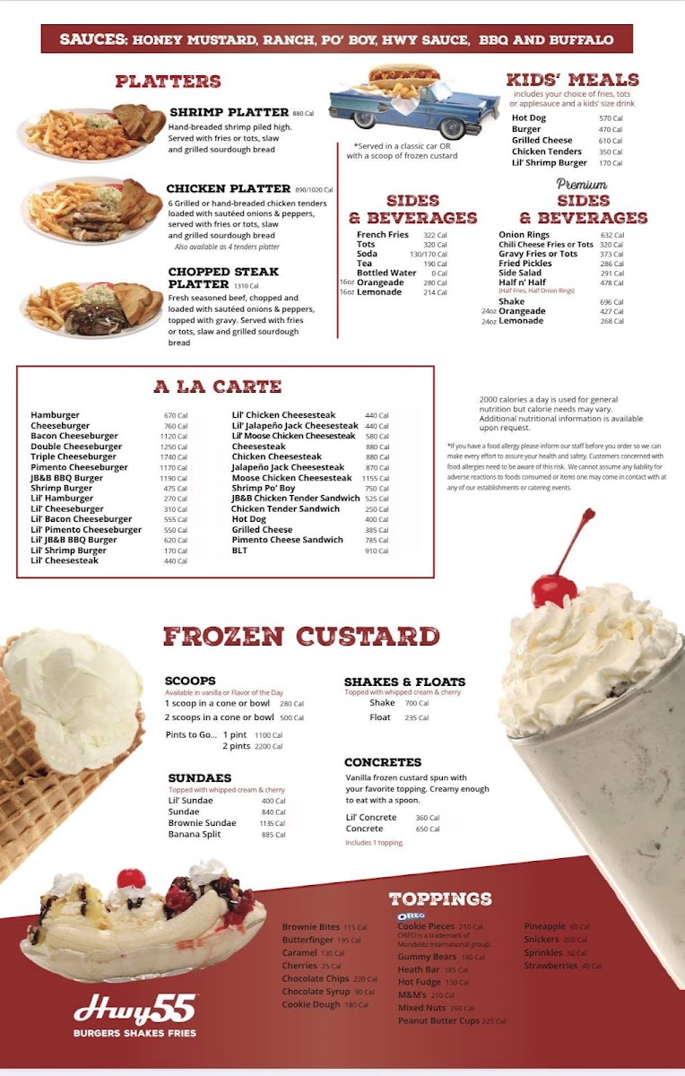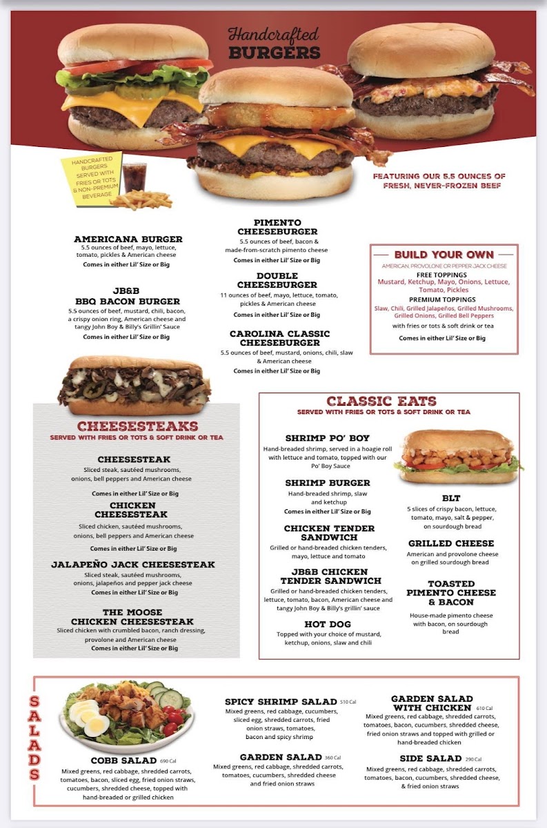 Highway 55, located at 1027 Danmac Ln, Jacksonville, FL 32254, offers a diverse and mouthwatering menu, perfect for any craving. The burgers are a highlight, with options like the Big Cheeseburger and Big Build Your Own Burger that allow you to craft your ideal meal. For those who enjoy a little heat, the Lil' Pimento Cheeseburger adds a spicy kick, while the Big JB&B BBQ Bacon Burger combines smoky barbecue flavor with crispy bacon. Each of these hearty burgers is a great choice for any burger lover.